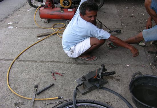 Nach über 1000 km hatte ich heute meinen ersten Platten, glücklicherweise als ich bereits in Padang angekommen war. Einen neuen 28er Schlauch zu kaufen scheint hier auf Sumatra schwierig zu sein, aber Schlauchflicker mit archaischen Werkzeugen, wie Feuertöpfen und Schraubstöcken, die die Reparatur für 5000 Rp durchführen, gibt es jede Menge.