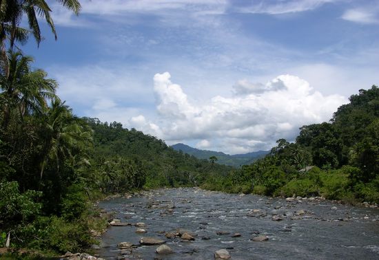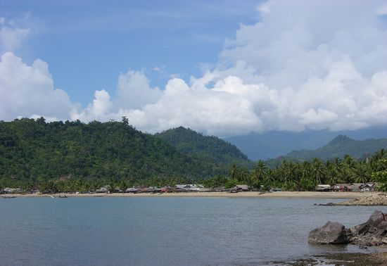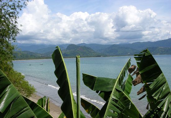 Die Küstenlandschaft südlich von Padang ist wunderschön, bergig und zerklüftet. Aus der Stadt hinaus ging es zunächst 10 km flach zwischen den Hügeln hindurch, bevor das erste Kap zu überwinden war. Hinter dem Strandresort Bungus ging es dann richtig in die Berge, ein kilometerlanger, steiler Anstieg mit anschließender Abfahrt durch ein Tal im Hinterland. Nach der Abfahrt waren es 15 km hügelige Strecke zurück zur Küste. Ab hier verlief die Straße dann meist sehr küstennah, teils flach, teils mit kurzen, steilen Passagen über Felsvorsprünge, bis nach 80 km Painan erreicht war, ein gepflegtes Städtchen in herrlicher Küstenlandschaft mit vorgelagerten Inseln und hohen, dschungelbedeckten Bergen im Hinterland. Lediglich die Strände sind in dieser Gegend nicht sehr attraktiv, da der Sand meist braun oder grau ist. Hinter Painan kam noch ein langer,steiler Anstieg mit kürzerer sehr steiler Abfahrt wieder hinunter zur Küste.