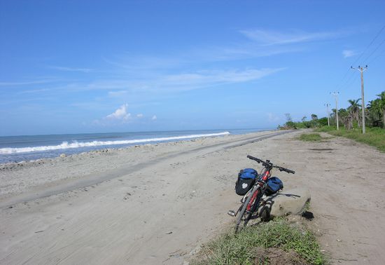 Diese Strecke nach Bengkulu, welche auf der Landkarte so verlockend aussieht, immer direkt die Küste hinunter, ist ein absoluter Alptraum. Die ersten 10 km ging es durch wenig attraktives Sumpfgebiet flach die Küste entlang, den Rest der Strecke wand sich das kurvige Sträßchen in stetigem auf und ab durch fast schattenlose Ölpalmplantagen und Brachland weitab von der Küste. Auf der gesamten Strecke gab es keine größere Ansiedlung und es war fast unmöglich etwas kühles zum Trinken aufzutreiben, da es in dieser Gegend nur halbtags, während der Dunkelheit, Elektrizität gibt. Die Sonne brannte erbarmungslos den ganzen Tag, ohne dass eine Wolke am Himmel zu sehen gewesen wäre. Bei 35°C im Schatten ohne kühle Getränke diese fast schon absurd hügelige, uninteressante Strecke zu fahren war eigentlich purer Masochismus.
