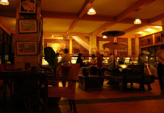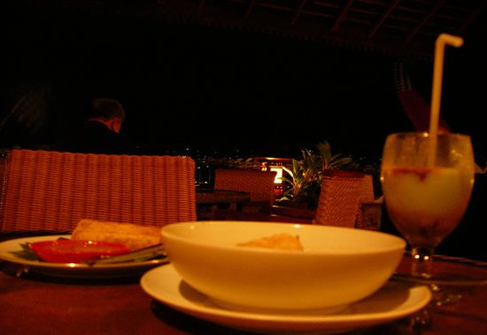 Wie bereits erwähnt war der Grund hier abzusteigen das Gumati, ein herrliches, sehr schickes Terrassencafé ein paar Häuser weiter. In wunderbarem Ambiente kann man hier bei Kerzenlicht in Korbstühlen sitzen, die kühle Brise genießen und auf die Lichter im Tal hinunter Blicken. Eine schöne Abwechslung nach den Wochen im ursprünglichen Sumatra. Das Essen hier war gar nicht mal allzu teuer. Ich hatte Lumpia (Frühlingsrollen) und Empe Empe (Fish Cakes in einer scharfen Essig-Soya-Sauce), was beides um die 15.000 Rp kostete. Dazu einen, wie immer, wunderbaren Juice Alpokat (Avokado Shake), eine der besten Erfindungen Indonesiens. Sehr ordentliche Bistroküche, aber in erster Linie geht es hier natürlich um das Ambiente.