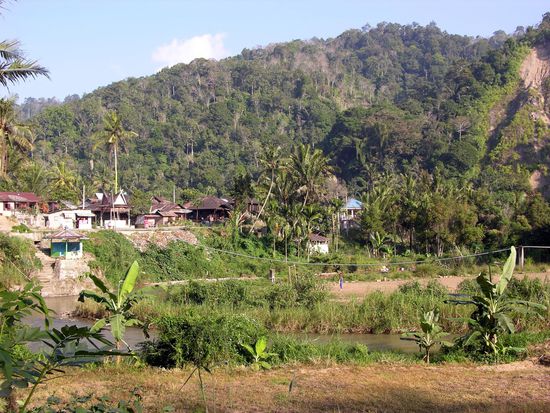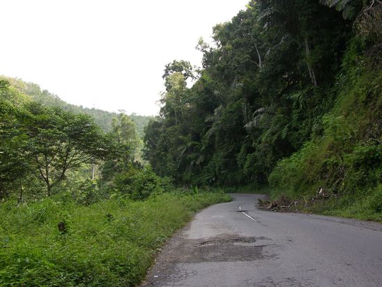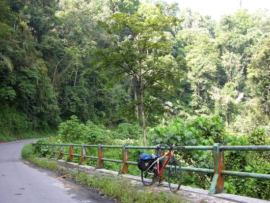 Die ersten 25 km gingen stetig, aber relativ sanft bergauf bis zur Passhöhe. Es folgte eine schöne 10 km lange Abfahrt durch ein einsames Tal. Der Straßenbelag heute war durchwachsen mit einigen sehr holprigen Passagen, aber auch einigen guten Teilstücken, außerdem herrschte glücklicherweise auf dem sehr schmalen Sträßchen wenig Verkehr. Nach der Abfahrt folgte eine lange, flache bis leicht hügelige, Strecke durch ein breites Tal mit zahlreichen Ortschaften. Die letzten zwanzig, landschaftlich sehr schönen, Kilometer waren dann wieder hügelig und es ging tendenziell bergauf, durch ein Tal eingerahmt von hohen Bergen. Ich überquerte am heutigen Tag die Grenze nach West Sumatra, ein stark muslimisch geprägter Teil der Insel, aber die Minangkabaus sind kaum weniger freundlich als die Bataks.