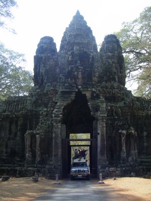 Am naechsten Tag besuchten wir die riesige Tempelanlage Angkor. Dort kann man unzaehlige Tempel von riesig gross (3km²), zu kaum noch erkennbar (1 Stein), entdecken. Um den groessten Tempel (Ankor Tom)zu besuchen muss man durch ein uraltes 15m hohes Steintor fahren.