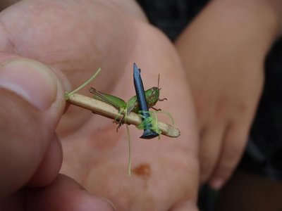 Da Toph nur eine Woche Zeit hatte um in Vang Vieng anzukommen, durchfuhren wir den Sueden im Schnelldurchlauf. Der erste Stop sollte an einem 100m hohem Wasserfall sein den wir aber nie fanden. Stattdessen zelteten wir an einem idylischen Fluss inmitten eines Nationalparkes. Dort erspaehten wir ein paar coole Insekten. Ein Stabtier und ein Alien?