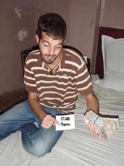 Schon einen Tag spaeter sollten wir um 10.00 Uhr morgens bei ihm im Buero sein. Wir warteten 2 Stunden bis es ueberhaupt los ging. Schon den ganzen morgen plagte uns ein schlechtes Gefuehl, mit so viel Geld in der Tasche, durch die Strassen Indiens zu laufen. Das Buendel Geld passte gerade so, in eine Plastiktuete verpackt (Geldbeutel war zu klein), in die Hosentasche.