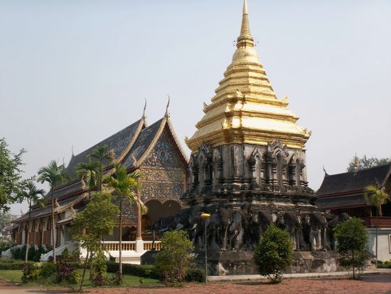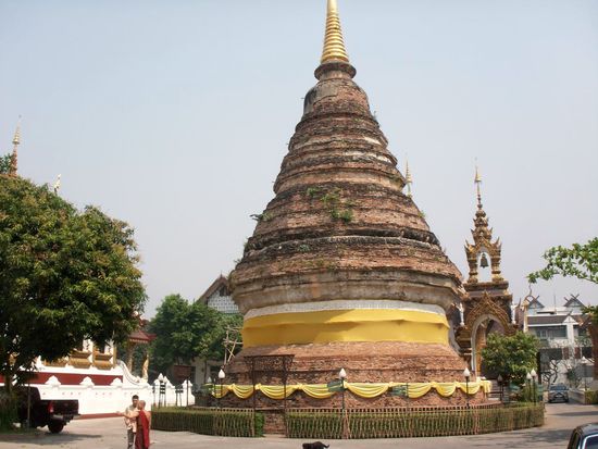 chedi (auch stupa): Teil des Wats, glockenförmiger, nach oben spitz zu laufender Bau, der meistens begehbar ist. Oft werden hier Reliquien des Buddha ausgestellt. Ein Wat kann mehrere chedis haben, die oft mit Blattgold überzogen sind.