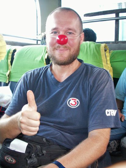 Jedenfalls sitze ich da vor mich hin und schwups, schon hab ich eine rote Nase auf der meinigen. 2 Mitreisende aus Belgien naemlich sammeln fuer ein Kinderspital lustige Fotos, um die Kinder zum Lachen zu bringen, da darf natuerlich eines vom "Clownonkel" nicht fehlen.