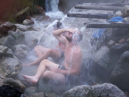 Der naechste See ist auch sehr gross, auch sehr schoen und weiter fuert die Reise zu den hot springs. Nein, das ist keine Band der 80ger, sondern ein kleines Kaff in the middle of nowhere wo viel heisse Luft aber noch mehr heisses Wasser vorhanden ist. Also, raus aus dem Gwandl (Gwandltag muesste doch bald in Salzburg sein, nicht?) und rein in die Badehose. Ein wirklich rustikales Vergnuegen!