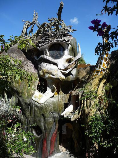 In einer Seitenstrasse besuchten wir das Hang Nga Crazy House. Madame Nga ist eine Kuenstlerin aus Hanoi, die dort in Dalat ein Haus baute. Es sah aus, wie eine Mischung aus Maerchenschloss und Hexenhaus. Es ist ein Guesthouse sowie ein Museum. Wir streiften durch enge kleine Gaenge und ueber kleine Treppen durch das Haus. Wir sahen uns die kleinen Zimmer an, die wie das Zuhause Bilbo Beutlins erschienen und genossen die Aussichten von den kleinen Tuermchen. Statik und Sicherheit gab es hier nicht. Manchmal dachten wir, wir fallen gleich vorne ueber, weil die Treppen kein Gelaender hatten. Es machte auch nicht den Eindruck, als haelt das alles noch lange. Auf der eine Seite waren die Zimmer fertig, am anderen Ende zerfielen bereits Teile und am wieder anderen Ende bauten tatsaechlich Leute weiter. Aber das war wieder unser gewohntes chaotischen Asien.