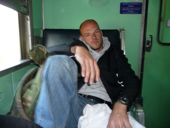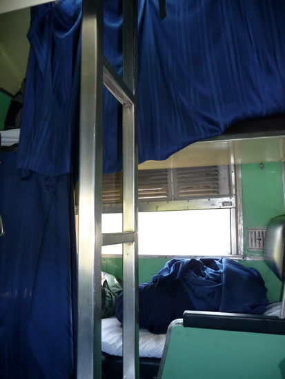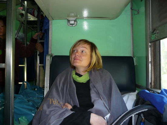 Wer wissen moechte, wie die Fahrt mit dem Nachtzug war, es war kalt, klabbrig, laut und ein bisschen schmuddelig. Zwei Sitze die gegenueber stehen, werden wenn die Nacht einbricht zusammen geklappt. Von oben wird ein zweites Bett heruntergeklappt. Frisches Bettzeug ist inklusive. Dann werden die Fenster von innen mit Gittern zu gezogen, so dass keiner von aussen nach innen kommt. Und als Trennung der Schlafkojen wird ein Vorhang eingehaengt. Die Fahrt von 700 km dauerte 13 h. Eine halbe Ewigkeit. Der Zug haelt fast an jeder Station.