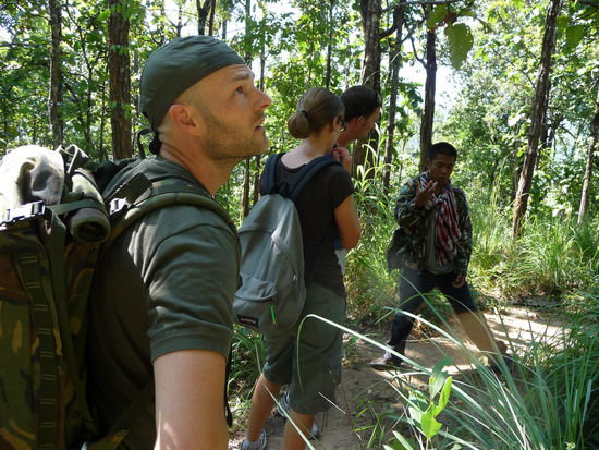 Hier im Norden konnten wir den ersten Trekkingausflug unternehmen und ihr glaubt es kaum. Wir wanderten durch den tiefsten Dschungel. Ueber Nacht. Das war ganz schoen unheimlich. Mit Macheten bewaffnet, stapften wir durch den Wald. Uns begegneten Tiger und Baeren. Ich hatte ne heiden Angst. Zu Essen gab es nur gegrillte Maden, die wir vorher selbst sammelten. An Schlaf war nicht zu denken. Unsere Wasserspender waren Zweige von Bananenbaeumen, die wir auslutschen mussten. Und zu guter Letzt wurde Pascal von einer Trichterspinne gebissen, ich saugte das Gift aus dem Biss (jetzt habe ich Herpes) und unser Guide holte einen Helikopter. Ich war fix und fertig als dann auch noch ein Jeti ueber mich herfiel und ....