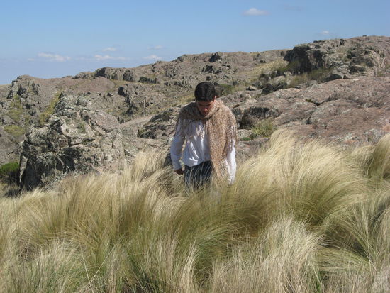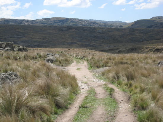 Der Fahrer setzte uns sage und schreibe mitten in der Pampa aus. Nur ein kleines Tor und ein Weg erwarteten uns. Hier waren wir also im Parque Nacional Quebrada del Condorito und wir begannen zu laufen; mit Sack und Pack. Alexis' Gepaeck bestand aus einer Plastiktuete mit Brot, sauren Gurken und einer Flasche Likoer.