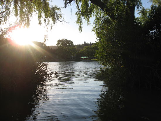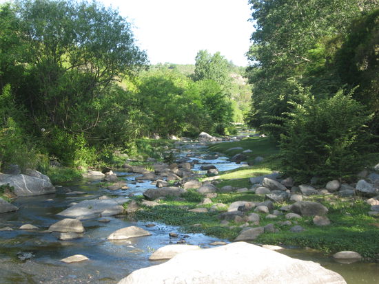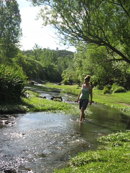 Talia ist inzwischen seit ungefaehr 6 Monaten hier und geht jetzt in einer knappen Woche nach Hause. Eigentlich schade, mit ihr macht das Reisen naemlich Spass! Also sind wir zusammen los und erstmal nach La Falda gefahren. Ein schoener, ruhiger Ort, mit netten, hilfsbereiten Menschen und nachdem wir draussen in dem Bombenwetter erstmal was gegessen hatten, machten wir uns auf die Suche nach einem Campingplatz. Um diese Jahreszeit haben noch nicht viele auf und sind ausserdem RELATIV teuer (15 Pesos - ca. 3,50 Euro; im Sommer kann man fuer 5 Pesos zelten!). Aber so stand unser Zelt ausserhalb des Ortes auf einer Anhoehe direkt an einem See. Sehr schoen! Es war sooooo angenehm still, wie man es nur empfinden kann, wenn man in einer Grossstadt, wie Córdoba mit ca. 10 Leuten zusammenwohnt! Dementsprechend faul fuehlten wir uns an dem Tag auch und schlenderten fast in Zeitlupe zu ein paar Wasserfaellen (sehr hoch, denn das Wasser fiel an hohen Felswaenden hinunter). Dort gab es Eis und Artesanales - alles, was wir brauchten! Spaeter gingen wir an dem Bach entlang, der aus den Wasserfaellen und der Staubruecke des Sees entsprang. Es war wirklich wunderschoen dort!