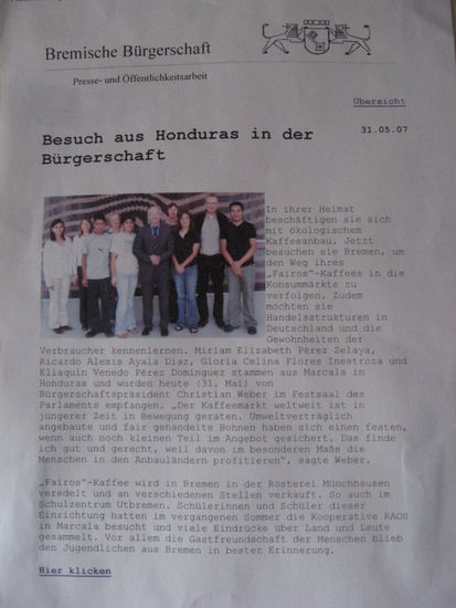 Wiedermal waren wir zeitig in der Unterkunft. Wir tingelten ein wenig durch den Ort, der auf uns sehr einladend wirkte! Es gibt einige weniger ausgebaute Strassen, in denen ein Marktstand an den anderen grenzt, einen schoenen zentralen Platz und viele freundliche Menschen sahen uns neugierig an oder gruessten einfach nur und wuenschten uns eine schoene Zeit. Wir suchten die ebenfalls im Lonely Planet erwaehnte Kaffeekooperative "Raos", in der wir fragen wollten, ob wir uns eine "finca" mal ansehen duerften. Wir waren erfreut zu sehen, dass Zeitungsartikel aus Bremen und anderen deutschen Gemeinden die Waende schmueckten, die scheinbar eine Handelspartnerschaft mit der Kooperation hier in Honduras haben.