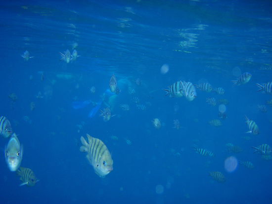 Kho Tao ist eine wunderschoene Insel besonders geeignet fuer Leute, die Tauchen oder Schnorcheln moechten. Wir haben uns im Lotus Bungalow Resort am Soiree Beach eingenistet. Da wir hier nur 3 Tage verbracht haben, konnten wir nicht allzuviel von der Insel sehen. Ich bin 1 Tag lang auf eine Schnorchel Tour gegangen. Insgesamt haben wir an 4 verschiedenen Riffen geschnorchelt... das beste war an der Shark Bay habe ich tatsaechlich Haie gesehen. Als ich den ersten kleinen Hai gesehen habe wurde es mir schon etwas komisch... doch dann sah ich 6,7... ich dachte mir dann nach einem Weilchen, dass ich jetzt wieder zum Boot zurueckgehe. Aber da, ca 10 m vom Boot direkt unter mir 3 grosse Haie!!! Uuuuaaaah, da schwamm ich dann schon etwas schneller zurueck... aber obwohl ich etwas Angst hatte, war das eine super Erfahrung. Leider konnte ich vom ersten Schnorchelgang keine Fotos machen, da mir mein netter Kollege seine Kamera nicht gegeben hat. Er hat aber nur einen Hai gesehen und der war zu schnell weg um ein Foto zu knipsen . Doch dann konnte ich ein paar super Fotos machen...