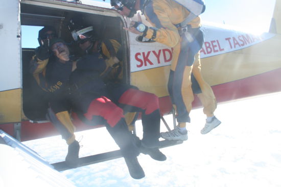 Anca war die Erste...und dann hang sie auch schon mit den Beinen aus dem Flugzeug, noch ein letzter Wink in die Kamerea (ihr Kameramann befand sich schon auf dem Flugzeugfluegel) Genau diese Prozedur wurde dann auch noch bei Fred und mir durchgezogen!!)
