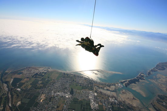 Nach ca.50 sec wurde der grosse Schirm geoeffnet und du wurdest wieder in die Luefte hinauf gewirbelt Jetzt kam der entspannte Teil des Fluges, das Paraglyding. Wir hatten Blick auf das Meer (Tasman Bay),die Berge,den Abel Tasman und da wir super Wetter hatten,konnten wir einen klitze kleinen Teil der Nordinsel sehen(behauptet zumindest Anca (-. Es war traumhaft schoen...