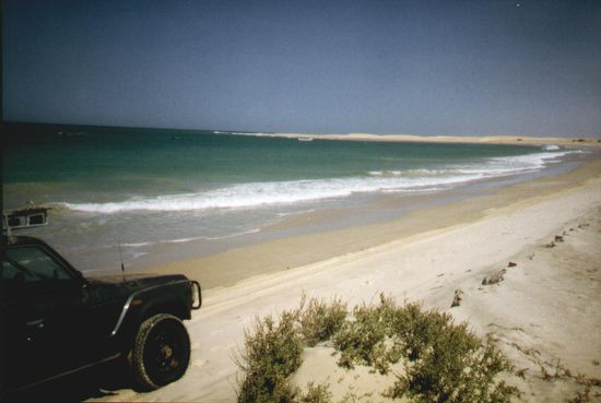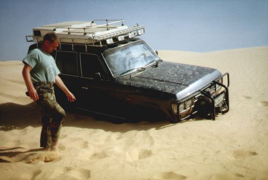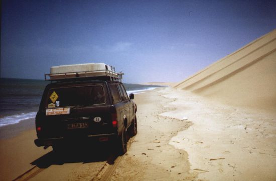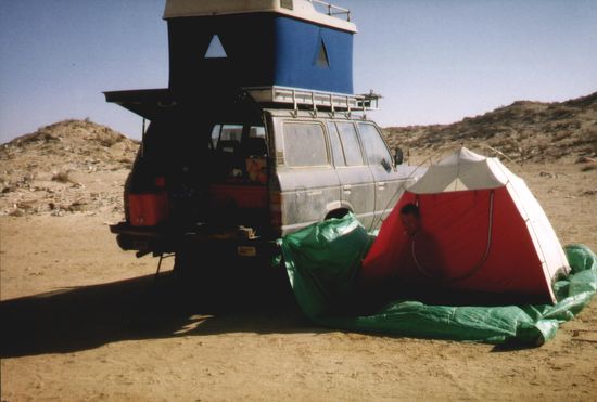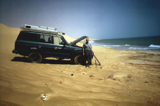 Bis 19:30 Uhr fahren wir durch den ganzen Ort. Überall gibt man uns zu verstehen, dass der Konsul von ??? unser Auto gesehen hat und es jetzt unbedingt kaufen möchte. Das ist uns alles zu heikel. Da es zu spät ist um in die Dünen zu fahren, gehen wir mitten im Ort auf einen Campingplatz. Hier treffen wir zwei Ossis, die sich wie die Schneekönige freuen, dass sie sich mit uns unterhalten können. Seit