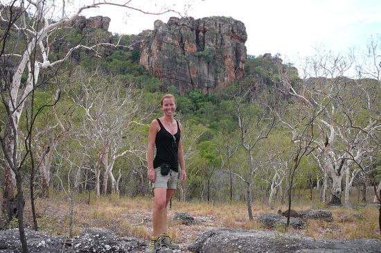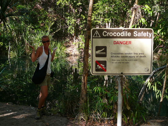 Am Dienstag Morgen 6 o'clock ging es los. 16 Leute on board + unser Guide Rob. Nach 1 - 2 Std. Fahrt stoppte Rob und nuschelte irgendwas in sich rein. Was soviel hiess wie: auf gehts "Holz sammeln". Wir schauten uns kurz verdattert an und kaempften uns lachend durch das Gestruep. Dann musste das ganze Holz oben auf unser Auto verladen werden. Ein Spass! Geschafft und weiter gings. Naechter Stopp war der Mary River, wo wir eine 2 Stuendige Bootstour machten und nach Krokos Ausschau hielten. Allerdings sahen wir mehr Voegel-Getiere als spektakulaere Krokos. Anschliessend empfing uns Rob mit dem Mittagessen. Haben mitten in der Pampa Wuerstli gegrillt! Gestaerkt ging es weiter zu Rock Art. Los ging unsere Wanderung. Als Bergauf! Haben und dort die Aboriginal Felszeichnungen, die schon 100 Jahre alt sind angeschaut und eigentlich viel ueber die Lebensweise erfahren. Eigentlich deshalb, weil wir nicht wirklich viel verstanden haben. Viel zu schnell ging der Tag rum und wir steuerten unser Nachtlager an. Fast angekommen und es goss in Stroemen. "Schoen das wir an die Regenjacken gedacht haben". Doch viiiiiiiiiiel schlimmer fande ich, dass wir die Nacht unter freiem Himmel verbringen muessen. Angekommen und schon war Stress angesagt. Einer bekam ein Brett, einer ein Messer usw. und los ging das Spasskochen unter Leitung von Rob. "Ai Ai Chef..." Waehrend das Kaenguru und Bueffelfleich (lecker) grillte gingen wir zu einer Aboriginal Frau, die uns Bilder zeigte und ebenfalls ueber das Leben und ihre Familie berichtete. Nach dem Essen am Lagerfeuer (unsere einzige Lichtquelle) war Bettzeit angesagt. Ich glaub es war noch nichtmal halb neun. Rob erklaerte uns wie wir in diesen Swaks schlafen bzw. wie wir unser Nachtlager aufbauen muessen. Jeder suchte sich einen Baum um diesen Swak zu befestigen und ganz schnell war es ruhig - ausser das heftige Gewitter in weiter Fern. Doch irgendwie kams immer naeher. "Schoen das wir unter Baeumen lagen" Doch wir schliefen trotzallem schnell ein! Keine Std. spaeter wurde ich von einem heftigen Sturm geweckt und kein Mensch ausser Rob lag mehr um uns rum. Ich versuchte Nina zu wecken. Doch wenn sie schlaeft, dann schlaeft sie, kann passieren was will. Nach haerterem Einsatz war sie endlich wach und strahlte voellig verplant rum. Wir schnappten unser Sack und Pack und liefen ins Toilettengebaeude. "Wer hat schonmal ausser viell. im Suff auf dem Klo geschlafen?" Skandal, aber wir waren im Trockenen, denn keinen Minute spaeter schoss es nur so runter. Wir hatten zwei Schlitzis dabei die es nicht mehr rechtzeitig schafften und waren erstmal schoen nass