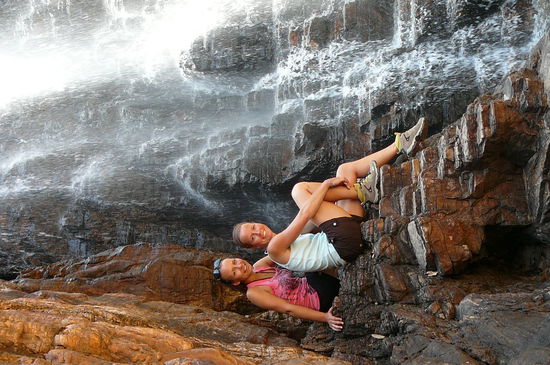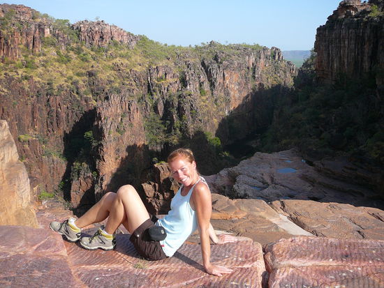 Am naechsten Morgen 5Uhr weckte uns Rob. Voellig verstrahlt kroch jeder aus seinem Swak und wir machten uns fertig. Noch schnell ein Fruehstueck, Abwaschen und los. Um 7Uhr stoppten wir. "Alle Wasserflaschen fuellen, Handtuch einpacken, feste Schuhe an und los...." Doch da wussten wir noch nicht was uns erwartet. Eine Wanderung vom Feinsten und das um diese Uhrzeit. Wanderung? Nein bei uns wuerde mans Rock Climbing nennen! Doch es hat sich gelohnt. Sind an den Twin Falls (gigantischer Wasserfall) angekommen. Auch da kletterten wir wieder quer beet umher. Anschliessend fuehrte uns Rob zu einem wunderschoenen Bergsee wo wir baden und relaxen konnten. Herrlich!!! Doch danach war die Erholung gleich wieder dahin, denn wir mussten alles wieder zurueck bzw. bergab - was sich ja bekanntlich noch schwieriger gestaltet. Auber auch da wurden wir mit tollen Bildern belohnt. Wie eine Bergziege ging es zurueck zum Auto, wo wir das Lunch vorbereiteten. Und wie sollte es anders sein die Climbing Tour ging weiter. "Sag mal wer hat das eigentlich gebucht und warum zahlen wir denn dafuer soviel Geld" Endlich erreichten wir die Jim Jim Falls. Dieser Wasserfall ist nur in der Regenzeit aktiv und somit sahen wir nur Felsen und badeten im genialen Berg-Pool wo angeblich Kroko-Netze gespannt waren. Bissi unheimlich war das schon!!! Nach einer laengeren Pause ging es auch hier weiter und die tolle Abkuehlung war schnell vergessen.