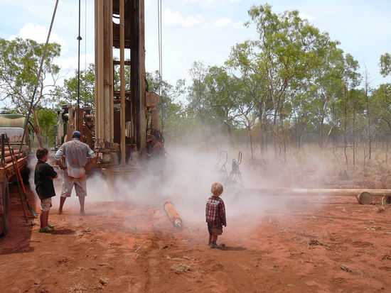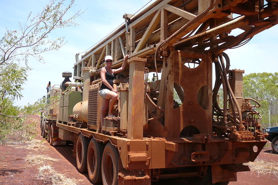 Naechster Tag - Arbeit stand auf dem Programm! Gespannt waren wir ja schon was Trevor so den ganzen Tag macht und womit er sein Geld verdient! Wir fuhren also mit zwei Trucks und nem Pickup (das wir fuhren - Spass ca. 35 km in den Busch. Trevor und Leni tuckerten dann alleine weiter und suchten nach Wasser. Recht schnell hatten sei ein Plaetzchen gefunden und ihr Lager aufgebaut. Dann ging die riessen Bohrerei los... Ein Bohrer ist ca. 6m lang. Wir durchbohrten mind. 10 Erdschichten mit jeweils anderen Farben bis zu guter letzt nach ca. 94 m auch Wasser in Sicht war. Nachdem es auch dort nur heiss war und es nicht wirklich Schatten gab, beendeten wir nach gut 4 Stunden die Arbeit und fuhren dreckig wie die Pig's zurueck. Huha...ich glaub so schmutzig war ich noch niemals!!! Die Kid's hatten natuerlich Spass und flutschten von einem ins andere Schlammloch... Im Motel angekommen - die Dusche war fuer ein paar Stunden unser bester Freund!