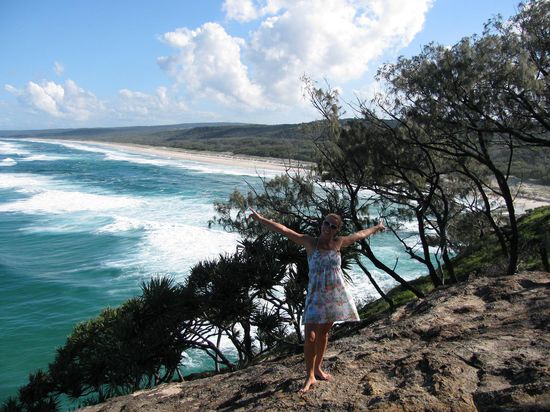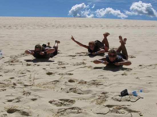 Am naechsten Tag hiess es dann auch See ya - bye bye Christoph und schon waren's nur noch 2! Dann wurden unsere letzten Tage auch schon in Stress umgewandelt - jaaaaaaaaaaaaaaaa auch wir haben Stress "to much to see" nur wo ist unsere Zeit geblieben? So ging's ein Tag auf Stradebroke Island (2 groesste Sandinsel) und den naechsten Tag auf Moreton Island (3 groesste Sandinsel mit der hoechsten Sandduene der Welt). Unser Tag auf Moreton war ein reinster adventure -action-day. Wir waren u.a. Sandboarding - yay!!! Zuerst dachten wir - ne da bringt uns keiner runter und dann war es wie ne Sucht! "More more more". Wenn es dort einen "Sand"lift nach oben gegeben haette, waeren wir dort nicht mehr weg! Anschliessend gings zum schnorcheln, um all den Sand wieder loszuwerden. Wir schnorchelten eingemummt mit Anzug, Handschuhen...um alte Schifffrakts. Dort fuetterten wir Fische und versuchten sie mit der Hand zu fangen Ups' da war noch was - ein Hai! Allerdings kein Hai zum Fuerchten, da er keine Zaehne hatte! Nun stand auch unser letzter Tag im schoenen Queensland vor der Tuer und wir mussten wieder von einem kleinen zu hause "WG Daniel" Abschied nehmen. 6 Std. Spaeter standen wir auch schon in Perth