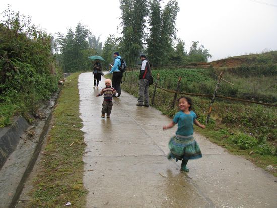 Der naechte Tag gestaltete sich mit etwas sightseeing, bissle Verlaufen und abends gings weiter mit dem Nachtzug in Richtung Sapa). Am Bahnhof wusste wiedermal keener Bescheid ung wir watschelten von einem zum anderen Gleis. Dafuer hatten wire in geniales Schlafabteil und so erreichten wir ganz schnell (81/2 Std.) Lao Cai(3 km von China entfernt . Weiter ging es 11/2 Std. mit dem Bus an unser Ziel! Wie kalt war es denn hier? 4 Grad und Nieselregen. Das Doerfle war eingepackt im Nebel. Huha und Heizungen gab es hier keine. Wir zogen von einem Café, Restaurant... ins andere und versuchten uns am Kamien aufzuwaermen. Apreski Helau! In meinem Bett war ich eingemummelt mit Muetze, Schal....und zwei dicken Bettdecken. Wir kamen nicht drumrum warme Sachen zu kaufen und dann ging es los zum trekking. Eine unserer Wanderungen fuehrte uns in die Cat Cat Village und wir lernten Land und Leute kennen.
