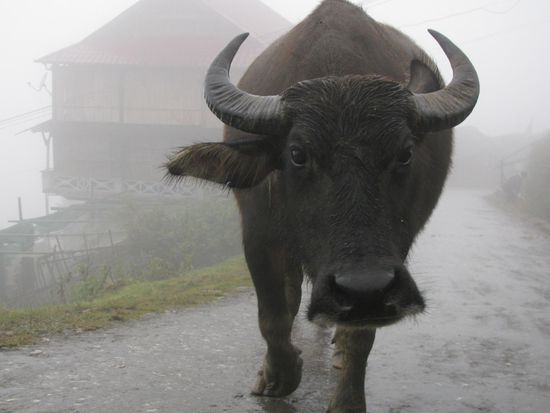Fuer den naechsten Tag nahmen wir uns viel vor also starteten wir mit unserer Tour sehr bald. Los ging es, doch nein wir waren nicht zu dritt - wir waren auf einmal zu sechst. Hatten wir private Reisefuehrer gebucht? Drei einheimische Frauen begleiteten uns, doch hier macht ja keener was ohne Geld. Also versuchten wir sie ein paar mal loszuwerden. Keine Chance, stattdessen bastelten sie uns Figuren aus Grashalmen, bauten Herzen und zeigten uns die einzelnen Doerfle. Nach guten 15 km nahmen wir nochmals eine Abwimmelaction vor - mit Erfolg. Wahrscheinlich wussten sie das unsere naechsten Wege durch Matsch und Schlamm fuehren wuerden. Nach guten 4 Std. steuerten wir den Rueckweg an. Oje nun gings nur noch Bergauf und mehr und mehr Nebel kam auf. Nachdem noch ca. 11 km vor uns lagen, stoppten ein LKw und bat uns an mitzufahren. Warum nicht, in einem LKW sind wir noch nicht durch die Berge gekurvt und noch dazu nicht mit 5 Leuten. Ja und so waren wir schneller zurueck als gedacht. Das kam uns nicht unrecht. Nathalie und ich gingen shoppen, immerhin war unser letzter Tag und wir hatten ja noch Geld uebrig.