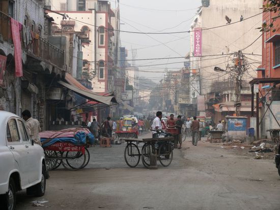 Als wir im Viertel Paharganj ankamen, am Main Basar, war dieser gut zu befahren, da der Basar noch schlief. Wir erkannten im Vorbeifahren ein Hotel, was auf unserem Plan eingezeichnet war, aber irgendwie ließen sie uns nicht raus, sondern fuhren weiter. Wir landeten natürlich weiter weg vor einem anderen Hotel, wo ich einen Engländer wenigstens mal fragen konnte, wo wir uns befanden. Da der Preis dieses Hotels bei 30 Euro lag, bestand ich drauf, dass die Kerle uns jetzt wieder zurückbrachten, wo wir auch hin wollten, zum Main Basar. Dann stieg der Freund des Taxifahrers aus, da ich uneinsichtig auf seine weiteren Vorschläge reagierte.