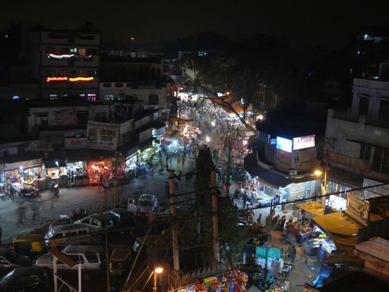 Zurück am Main Basar wurden wir von dem Trubel schier überwältigt. Diwali, wie Weihnachten, steht vor der Tür, und jeder Inder tätigt seine Geschenkeinkäufe. Alles ist glitzernd bunt dekoriert, es herrscht ein unglaubliches Treiben.Da die Polizei die Straße bis auf Ausnahmen für alle (unaufhörlich schrecklich laut hupenden) Fahrzeuge gesperrt hatte - aus Angst vor weiteren Bombenattentaten - waren die Massen noch aushaltbar. Trotzdem zog es uns in die Höhe, d.h. in ein Rooftop-Restaurant.. Im ersten wurde das gute Kingfisher in einer Teekanne mit dazugehörigen dickwandigen Tassen serviert, was zwar ulkig, aber nicht genussvoll war. Außerdem waren die Mauern so weit hochgezogen, dass man gerade nicht nach unten zu dem tollen Treiben runterschauen konnte. Zumindest konnten wir von dort oben den Dachgarten unserer Wahl ausmachen.