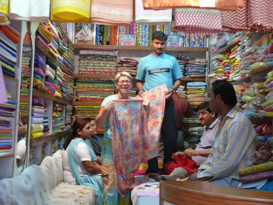 Der nächste Gang durch die Altstadtgassen führte uns in ein vegetarisches Restaurant, danach liefern wir auf den Stoffmarkt, denn ich wollte mir einen Salwar Kamez nähen lassen. Die Auswahl in den ca. 50 Schuhschachtel-Geschäften trieb mich zum Wahnsinn, aber dank meines Farbfächers (so was hatten die Verkäufer auch noch nicht gesehen), fand ich meine Farbrichtung.