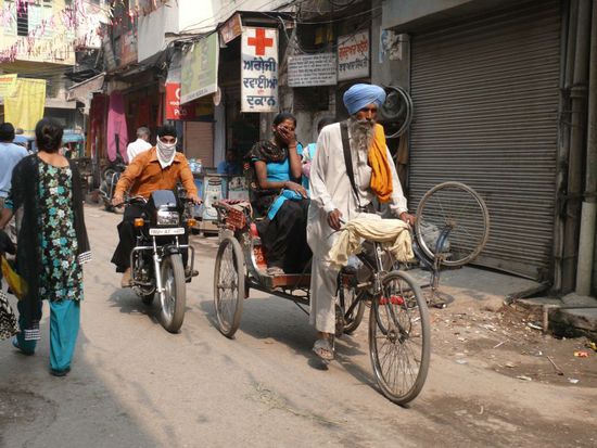 Ich lief mit meinem vorgestern gekauften Stoff zum Stoffmarkt und staunte nicht schlecht, dass um 10 Uhr immer noch alles zu war. Spätaufsteher, diese Inder, eigentlich sehr sympathisch. Auf meine Frage hin, ob der Schneider noch öffne, erhielt ich die Antwort 11.30 Uhr, was ich schon mal gar nicht glaubte. Ich suchte mir der ersten offenen Laden aus, hatte das Glück, einen englisch sprechenden Händler zu erwischen und kaufte mir noch einen weich fallenden Stoff für die Punjabi-Stil-Hose, das ist eine, die einem wolkenstoa-mäßig um die Beine hängt, sieht toll aus unter dem T-Shirt-Kleid.