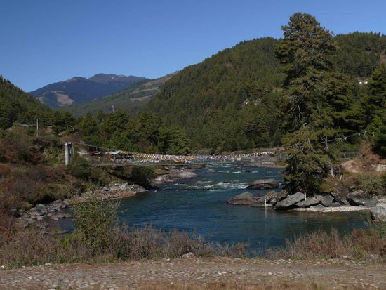 Danach machten wir eine Wanderung, liefen ca. 3 Stunden am Wildwasserfluss entlang und durch Wald und Wiese, der 1. Teil des Bumthang-Cultural-Treks. Und schön warm war es in der Sonne!
