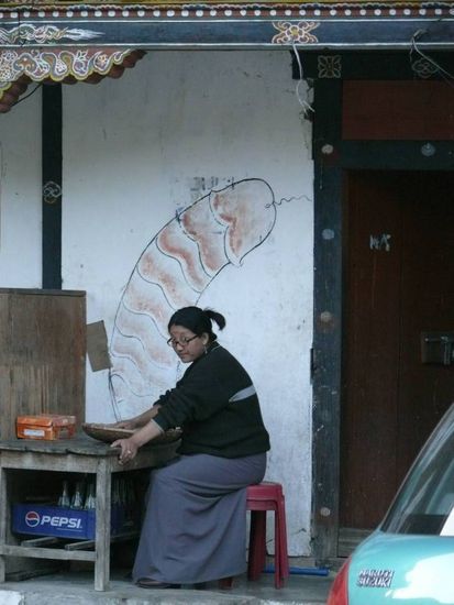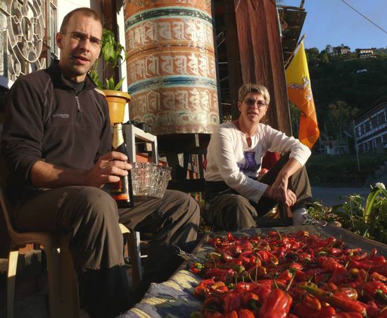Ich entdeckte eine Bar, wo vor der Tür auf einer Ablage die Chillies trockneten, was sich als Tisch anbot. So schleppten wir zum Verwundern der Inhaberin 3 Stühle raus und und bestellten ein Bier, Hit aus Skikkim, for sale in Bhutan only. Schmeckte nicht schlecht.