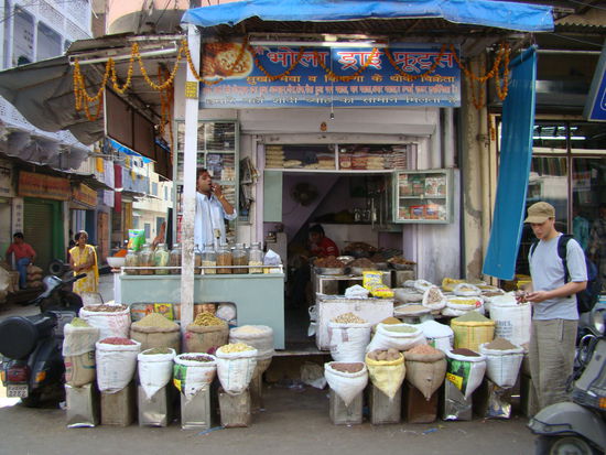 Hier gab es gute Thali-Restaurants bei denen man für ca.60 Rupies (1.50 CHF) so viel essen kann wie man will, schon dabei zuzuschauen, wie sich der Teller in Windeseile füllt, sobald man sitzt, ist ein richtiges Erlebnis. Man wird von bis zu zehn Männern bedient, von denen jeder eine Spezialität austeilt.