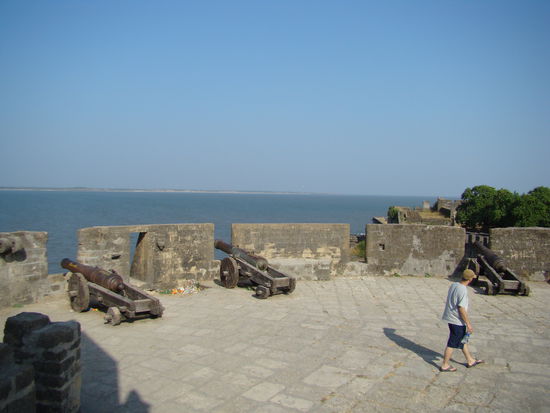 In Diu fanden wir ein sehr sauberes Gästehaus das von einer katholischen Familie geführt wurde. Hier herrschte eine sehr gemütliche Atmosphäre und das Haus- Fischcurry schmeckte fantastisch! Wir mieteten vom Sohn des Hauses für zwei Tage ein Moped und erkundeten damit die gesamte Insel, welche schnuckelige 11 mal 3km gross ist. Besuchten die Höhlen die aus der Zeit des Portugiesischen Kolonialismus stammen und die alte Festung aus derselben Zeit. In Diu herrscht eine spezielle Mischung aus indischer Kultur und christlicher Religion, so standen in jeder Ecke genau wie in den anderen Indischen Städten kleine Schreine, hier beherbergten sie aber statt hinduistischen Göttern kleine Jesus und Maria Bilder. Die Strände hier sind traumhaft schön, wir dachten schon fast, Indien liege nicht am Meer und so Menschenleer dass sich sogar Shanti ins Wasser traute...