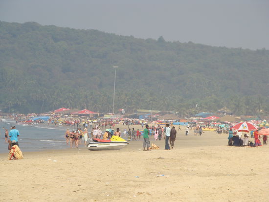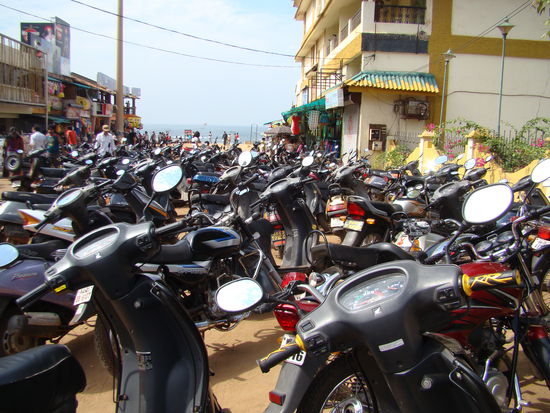 Die Häuser in diesem Portugiesischen Viertel, sind alle in schönen Pastellfarben gestrichen und es hat zwei weisse, christliche Kirchen, die überaus gut besucht werden. Nach fast zweistündiger Suche, die Hotels waren alle ausgebucht oder viel zu teuer, fanden wir dann im Hotel Paradise Inn Unterschlupf, hier wurden unsere Rucksäcke, als Reaktion auf die Anschläge von Mumbai kontrolliert. Wir mieteten einen Roller um an die vielumschwärmten weltberühmten Strände von Goa zu fahren. Am Beach angekommen, war die Enttäuschung gross, kein weisser Sand, neben "Fleischbergen" hatte es riesige Müllberge und man hatte keine fünf Minuten ruhe, alle wollten uns irgendetwas verkaufen. Bald fingen sie mit der Müllverbrennung an und ein stinkender, beissender Rauch zog über uns hinweg, so flohen wir recht schnell wieder. Doch beim Töffparkplatz angekommen, mussten wir feststellen, dass alle genau dasselbe Modell fahren und so begann die Suche indem wir alle mit dem Schlüssel durchprobierten, bis Einer passte. Da wir den Roller aber noch bis zum Abend gemietet hatten, gab's für Shanti noch die erste Fahrstunde. Hier merkten wir zum ersten Mal, dass Sonntag war, im Gegensatz zu anderen Orten war in Goa alles geschlossen und ruhig, sogar viele Restaurants.