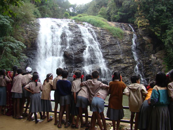 Um 5 Uhr wurden wir vom üblichen Rufen geweckt, immer wieder verblüffend wie schnell die Inder sind, bis wir richtig wach waren, war der Bus schon fast leer. Mit dem Tuk Tuk zum nächsten Bus Stand gefahren, kamen wir gerade noch rechtzeitig, damit wir auf den Bus nach Madikeri, der schon anrollte, aufspringen konnten. Wir fuhren auf der rund fünfstündigen Fahrt durch sehr schöne Urwaldähnliche Landschaften und Gummibaumplantagen. Wir sind im Hotel Dawn untergekommen, was eigentlich mehr ein Familienhaus ist, in dem vorige Zimmer vermietet werden, denn wir wohnten im selben Haus und teilten Dusche und WC ebenfalls mit ihnen. Anoop der das Haus eigentlich führt, hatte vor sechs Monaten einen schweren Töff Unfall und ist noch mitten in der Genesung, daher übernehmen das seine Mutter und seine Freundin Susanne, die aus Deutschland kommt, zur Zeit gemeinsam. Sein Bruder wohnt auch noch mit im Haus und sein Freund Yeashu übernimmt für ihn die Führung der Trek's. Wir haben ein gutes Restaurant gefunden, wo wir zweimal täglich Masala Dosa reinhauten, wenn man Paper Dosa bestellt, kriegt man eine Rolle die so gross ist wie der ganze Tisch, allerdings nicht mehr gefüllt, leider verpassten wir es, dies für euch zu fotografieren, ausserdem gibt es da super Badam Milk (Mandel und Safran), die den Chai etwas ablöste, der hier auch nicht mehr wirklich gewürzt war und eher Schwarztee mit Milch entsprach. Wir besuchten den Raja Seat, ein Park wo man Sonnen Auf- und Untergang mit herrlichem Panorama geniessen kann, nach Sonnuntergang legt hier ein Springbrunnen der Speziellen Art, zu Musik und mit farbigem Licht unterstützt, eine Show ein. Während bei uns wohl ein lautes Oh und Ah erklingen würde, geussen und quitschen die Inder wie auf einer Geisterbahn, alleine das ist schon sehenswert. Da wir noch ein Tag auf den Trek warten mussten besuchten wir die Abba Wasserfälle, ganz hübsch aber für uns nicht wirklich speziell. An solchen, auch von Indischen Touristen stark besuchten Orten, werden wir sehr oft geknipst. Beim Rückweg probierten wir Zuckerrohrsaft, der in grossen mit Benzin betriebenen Pressen frisch gemacht wird, sieht nicht wirklich appetitlich aus, schmeckt aber fantastisch, ein bisschen wie Honigmelone.