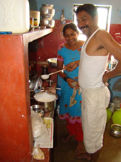 Spontan bot uns Jeashu an bei ihm zu Hause einen Probekochkurs zu nehmen, wobei wir die ersten Kochschüler waren und so also für beide Seiten ein Experiment. Wir lernten von seiner Frau Mansula Masala Dosa zu kochen, was vor allem Daniel freuen wird...
