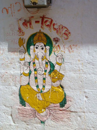 Weiter führte er uns an schönen Sandsteinhäusern welche fast alle mit einem Ganesh Gemälde verziert waren, daneben stand immer das Hochzeitsdatum des ersten Kindes, Märkten und unzähligen Restaurants vorbei durch den Jaislmer Fort. Hier hatte sich der Guide richtig gelohnt, er führte uns auf ein Dachterrassen Restaurant von wo aus man die ganze Stadt überblicken konnte, erst da wurde uns bewusst wie riesig sie war (90 000 Einwohner mitten in der Wüste).