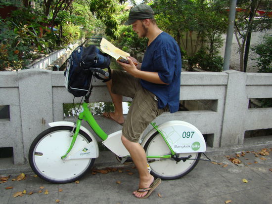 Die Zeit, als wir auf Bescheid, des Reisebüros warteten, nützten wir für eine Erkundungsfahrt mit dem Green Bangkok Bike, unterwegs bestaunten wir den Wat Pho, sehr beeindruckend war der vergoldete 45m lange, liegende Buddha, die Statue symbolisiert Buddha bei seinem Eingang ins Nirwana.