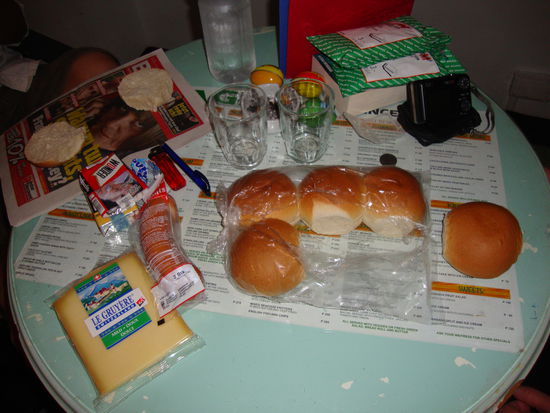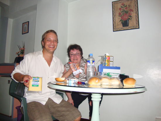 Nachdem wir uns zu einer nahe gelegenen Bäckerei durchgefragt hatten, konnte der Festschmaus mit Leckereien aus der Schweiz beginnen. Zu den Klängen unseres Mp-3 Players, genossen wir Brot mit Cervelat und Käse, zum Dessert gab's Schweizer Schokolade mit Schoggidrink und sogar Osterhasen hatte sie uns mitgebracht!