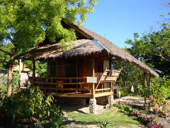 Nachdem wir das teure und schäbige Dreierzimmer welches uns der Tricyclefahrer andrehen wollte ablehnten, fanden wir seinen Versicherungen, alles andere sei viel teurer, zum Trotz, nur 15m nebenan ein neues, zweistöckiges Bambusbungalow mit Terrasse für 100 Pesos weniger.