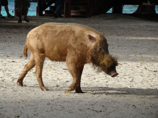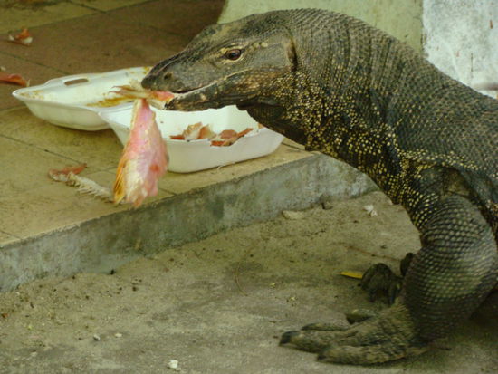 Gegen Mittag wurden wir abgeholt und zur Nachbarinsel Sapi gebracht wo wir den Nachmittag an einem schönen Strand verbrachten. Im Gegensatz zu Gaya wo wir ganz alleine unterwegs waren hatte es hier schon einige Leute und sogar ein Restaurant. Am Abend tauchte dann ein Wildschwein aus dem Wald auf, das auf Resten hoffte und schon den ganzen Tag lauerte eine Gruppe Warane um den Grill herum.