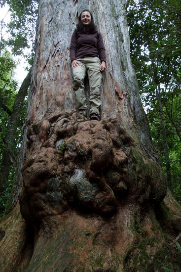 21.03.09 - Mit einer kleinen Portion Übermut im Gepäck, brechen wir auf zu einer sechsstündigen Rundwanderung durch den Regenwald. Unser Weg führt uns über einen sehr steilen Bergpfad in Richtung Gipfel des Mt. Peel. Unserer Wanderkarte nach, müssen wir darauf achten, früh genug links vom Weg abzubiegen, weil sich sonst unser Weg um ca. 1000 Höhenmeter und wahrscheinlich 30 Stunden Wanderzeit verlängert. Wobei unsere Wanderkarte aus der Kopie einer kleinen Broschüre über die Gegend, in der die Wanderwege grob eingezeichnet sind, besteht. Diese Karte sagt jedenfalls, dass wir nach 40 Minuten links abbiegen müssen. Sehr exakte Angabe. Nach einer Stunde ist noch keine Abzweigung in Sicht. Na ja, vielleicht kommt sie noch. Vielleicht ist die angegebene Zeit etwas knapp bemessen. Nach eineinhalb Stunden werden wir dann aber skeptisch, ob wir denn noch auf dem richtigen Weg sind. Da es anfängt zu regnen, und wir befürchten, dass sich der Weg bald in einen Sturzbach verwandeln könnte, kehren wir um, was wir allerdings nach eineinhalb Stunden schon wieder bereuen. Auf dem Schild am Eingang des Weges, ist die Zeit bis zur Abzweigung mit 1 Stunde und 40 Minuten angegeben. Super Karte, die wir da haben. Da fehlt wohl eine "1". Wir lassen uns aber davon nicht beeindrucken, und wollen das Pferd jetzt von hinten aufzäumen. Sprich, wir gehen jetzt in die entgegengesetzte Richtung. Eine gute Entscheidung. Der Weg ist sehr angenehm zu laufen und die Vegetation besteht aus wunderschönen Farnenwäldern und einigen sehr beeindruckenden, riesigen Bäumen. Nach einiger Zeit beginnt der Weg jedoch wieder anzusteigen. Und unsere Lust, da noch mal hochzulaufen zu sinken. Wir drehen also um und laufen zu unserem gemütlichen Bussle zurück. Genug trainiert.
