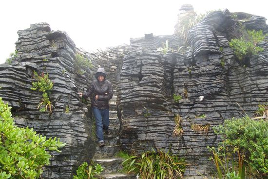 Auf dem Weg nach Hokitika bietet sich dem Gourmet unter den Touristen ein Stopp bei den Pancake Rocks an. Hier gibt es sehr leckere Pfannkuchen! Und ganz viele Asiaten mit Kameras, die allerdings nicht zu wissen scheinen, wo sie hier sind. Keiner isst Pfannkuchen! Nur die Janine und der Tobi. Mmh, komisch... Ein weiteres Phänomen hier ist, dass die ganzen Touristen in Scharen durch den waagrecht fallenden (Kann etwas waagrecht fallen?) Regen zur Küste pilgern. Was da wohl sein mag? Der Sache gehen wir nach und finden Felsen vor, die aussehen, wie aufeinander gestapelte Pfannkuchen. Verrückt. Was das 'ne Arbeit gewesen sein muss. Und das nur um ein paar Pfannkuchen zu bewerben. Und dann essen die Touris noch nicht mal Pfannkuchen. Na ja...