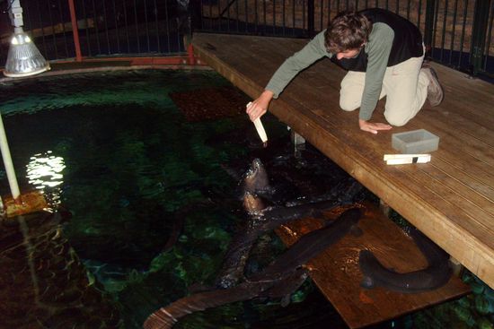 In Hokitika sehen wir endlich unser erstes Kiwi. Also nicht die Frucht, die man auch in Deutschland in jedem größeren Supermarkt besichtigen kann, sondern den wuscheligen, flügellosen Vogel, der so was wie der neuseeländische Bundesadler ist. Anders als erwartet, stellte sich heraus, dass die Kiwis in Neuseeland eher seltene Tiere sind, denen man zu dem nur Nachts begegnen kann. Zu unserer Schande müssen wir gestehen, dass wir uns eine Kiwisuche in der kalten Nacht und die damit verbundenen unumgänglichen Sandfliegenbisse gescheut haben, und uns in ein Kiwihaus begeben haben. In diesen allerorts vorhandenen Kiwihäusern wird versucht, die vom Aussterben bedrohten Tiere zu schützen. Zudem haben faule Touristen wie wir hier die Möglichkeit, Kiwis auch bei Tag zu sehen. Außerdem gab es in dem Kiwihaus 100 Jahre alte, riesig große Aale, die ich sogar füttern durfte!
