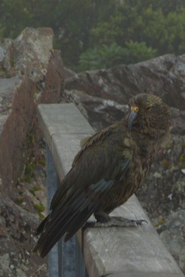 Die Anstrengung lohnt sich doppelt, da erstes die kurvenreiche, steile Gebirgsstraße atemberaubende Eindrücke der neuseeländischen Alpen vermittelt, und zweitens nicht wir uns verausgaben, sondern mal wieder unser armes Bussle. Am Höhepunkt der Fahrt - sowohl topographisch als auch dramaturgisch - bekommen wir sogar noch ein Paar wildlebende Keas, sehr intelligente, freche Bergpapageien zu sehen.