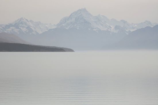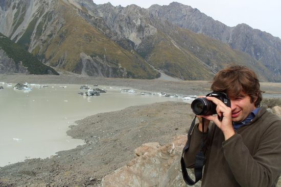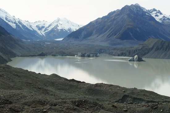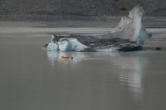 18.4.09 - Da wir ohnehin schon einen riesigen Umweg fahren, beschließen wir, den Tasman Glacier, den größten Gletscher Neuseelands, in der Nähe des Mount Cook zu besuchen. Das bedeutet zwar noch mal über 100 km mehr, aber das macht ja den Braten jetzt auch nicht mehr fett. Leider ist der Anblick des Gletschers etwas enttäuschend, da er von einer meterdicken Geröllschicht bedeckt ist, der Gletschersee dagegen ist um so eindrucksvoller. Dort sind riesige kleine Eisberge zu bestaunen. (Bewusste Antithese, da die Eisberge verglichen mit den Booten auf dem Gletschersee riesig erscheinen, verglichen mit Eisbergen in der Antarktis hingegen eher klein sind. - Anm. d. Red.)