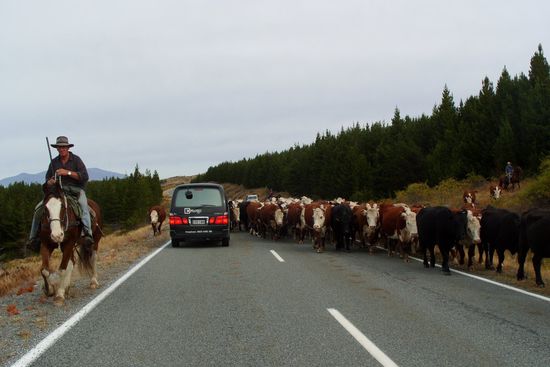 Auf dem Rückweg zur ursprünglichen Route, begegnet uns etwas, wofür in Deutschland jährlich tausende Menschen ins Allgäu pilgern. Ein Viehscheid, oder Almabtrieb für den Flachlandtiroler, mit richtigen Cowboys! Nur das Bierzelt hab ich vermisst. Na ja, die müssen halt noch viel lernen hier unten. Bis Kultur sich bis ans andere Ende der Welt ausbreitet...