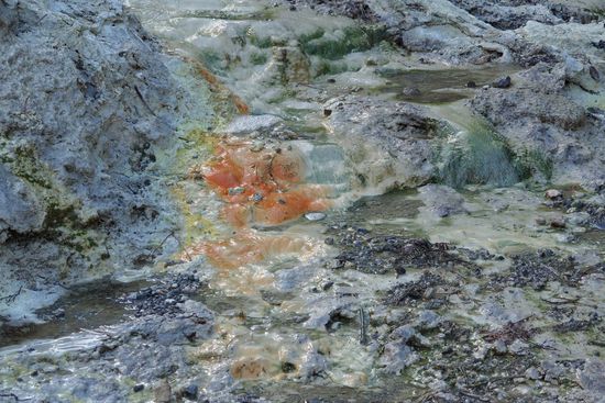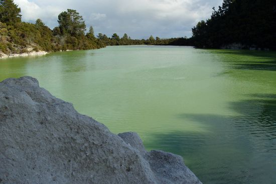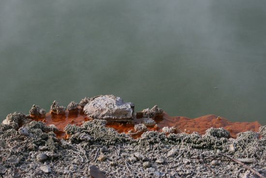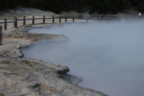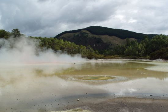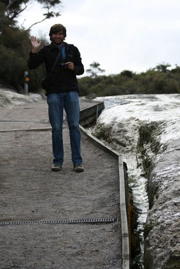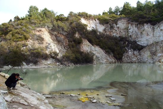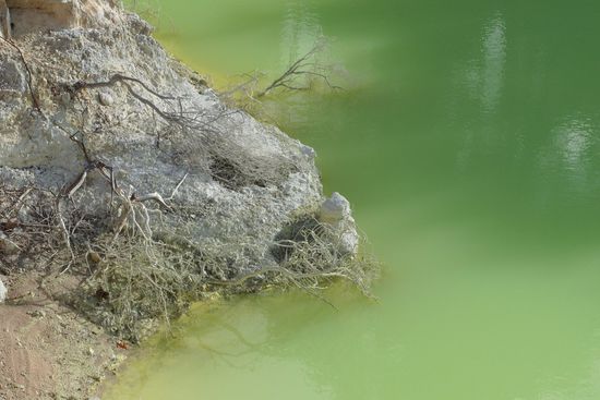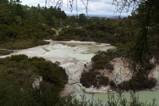 Spät am Abend erreichen wir die stinkende Stadt Roturoa. Keine Sorge, Roturoa ist kein zweites Invercargill (siehe Kapitel "Abschied von Sven"). Der Grund für den elenden Gestank der Stadt ist ihre Lage in Mitten eines Geothermalgebietes. Die Nase ist jedoch das einzige Sinnesorgan, welches hier in Roturoa im wahrsten Sinne des Worte die Ar...karte zieht. Die restlichen Sinne frohlocken beim Baden in heißen Thermalbecken oder beim Spaziergang durch die farbenfrohen Landschaften aus Kratern, Mineralseen und Schwefelfeldern. Aber an dieser Stelle sagen Fotos wohl mehr als tausend Worte: